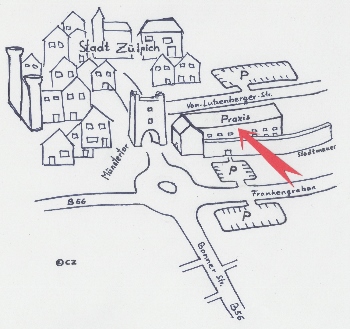 Die Praxis befindet sich in dem sanierten und erweiterten Gebäudekomplex direkt neben dem Münstertor zwischen der Von-Lutzenberger-Straße und dem Frankengraben.